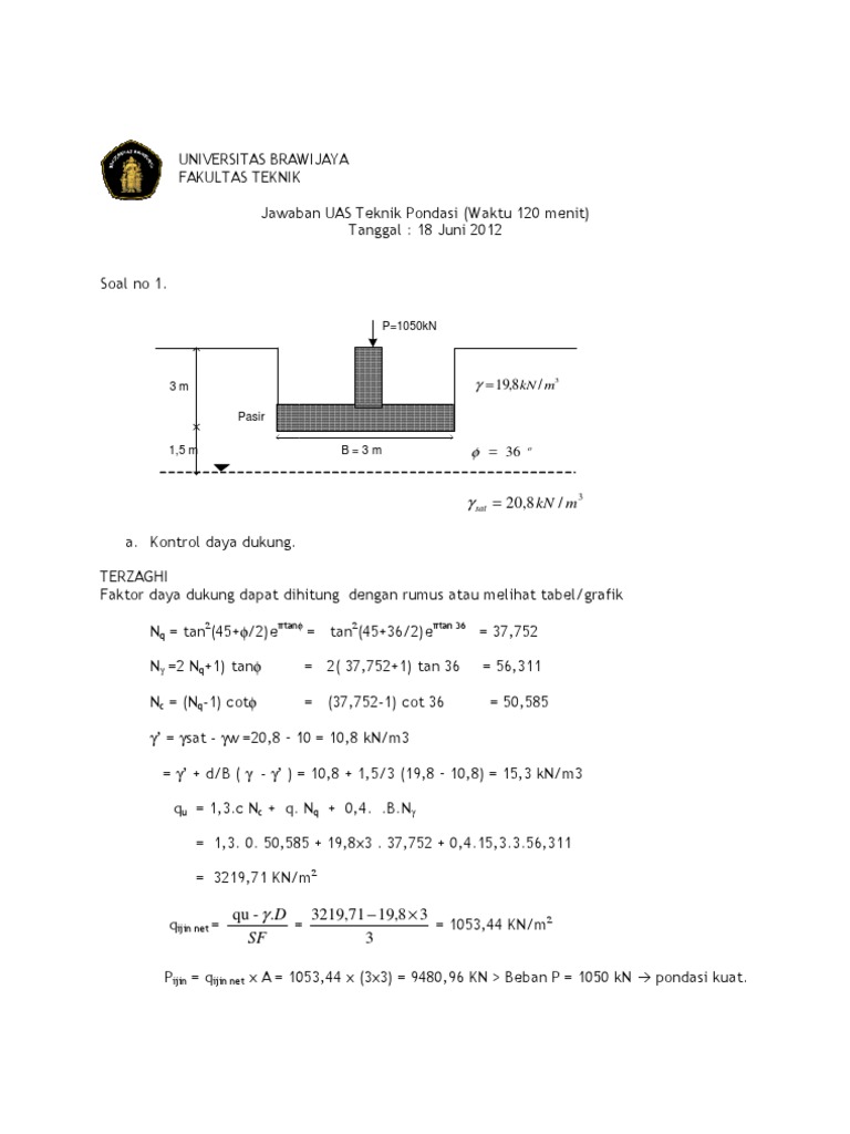 =(10000 x 2 + 8000 x 1 + 12000 x 2 ) / 5 = 10400 kn/m2. Daya dukung ultimate pengaruh bentuk pondasi terzhagi memberikan pengaruh faktor bentuk terhadap daya dukung ultimit yang didasarkan. Catatan mahasiswa depresi contoh soal rekayasa pondasi tiang pancang. Inilah pembahasan lengkap terkait contoh soal mekanika rekayasa 1 teknik sipil pdf. Buku teknik sipil rumahwaskitacom free download borrow. Contoh soal dan jawaban rekayasa pondasi 1 contoh soal terbaru. Contoh soal dan jawaban teknik sipildoc. Rekayasa pondasi kisaran teknik sipil. Soal kuis teknik pondasi pdf document from reader015.fdokumen.com. Terima kasih telah mengunjungi ke contoh soal terbaru 2019. Gambar 1.2 pondasi menerus gambar 1.3 pondasi telapak gambar 1.4 pondasi kaki gabungan gambar 1.5 pondasi pelat pondasi dalam adalah pondasi yang biasanya dipasang pada kedalaman lebih dari 3 meter dibawah permukaan tanah. Hitunglah factor keamanan terhadap kegagalan daya dukung. Contoh soal dan jawaban mirip no 2 uts pondasi 1.