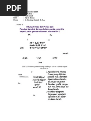 Daya dukung ultimate pengaruh bentuk pondasi terzhagi memberikan pengaruh faktor bentuk terhadap daya dukung ultimit yang didasarkan. Beban terbagi rata di atas permukaan (qo) sebesar 20 kn/m. Soal analysis overall stability dpt! Contoh soal dan jawaban mirip no 2 uts pondasi 1. Contoh soal dan jawaban rekayasa pondasi 1 contoh soal terbaru. Analisis pondasi rakit terhadap pondasi tiang pancang pada tower sst 100 meter di karawang. Qult 13 c nc df γ nq 04 γ b nγ. View kumpulan soal rekayasa pondasi.doc from a en misc at tadulako university. Pondasi rigid dengan ukuran 1 x 2 m seperti gambar diatas tentukan besar penurunan dipusat pondasi. Hitung daya dukung ultimit angker menggunakan metoda empiris jika lebar, b, adalah 0,3 meter, 0,6 meter, 0,9 meter dst dan gambarkan grafiknya antara b dan daya dukung ultimit. Beban kolom arah vertikal dengan garis kerja beban di pusat pondasi. = 1,5 m dan hasil uji spt. Disadur dari bahan mata kuliah rekayasa pondasi oleh bapak ir.adriani, mt (dosen fakultas teknik, universitas lambung mangkurat) penurunan pondasi dangkal.