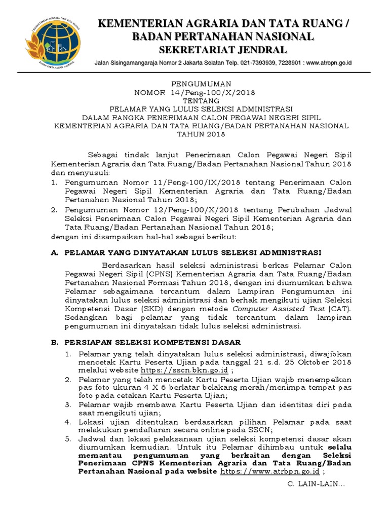 Panitia cpns atr bpn 2018 menjadwalkan pengumuman hasil seleksi tes skd cat pada bulan pada tanggal 08 november 2018 di website resmi cpns.atr bpn.go.id. Pengumuman hasil tes skb cpns atrbpn 2021 2020, peserta lulus passing grade skd skb cpns atr bpn 2021, lolos lulus tahap akhir skd skb cpns atrbpn 2021. Seleksi kompetensi dasar cpns 2018 atr bpn adalah tahap setelah peserta lulus seleksi administrasi. Untuk itu silahkan download pengumuman hasil skd cpns kemenkumham pdf. Lamaran yang dikirim kepada kementerian atr/bpn sebelum pengumuman ini dan sesudah waktu yang ditentukan dianggap tidak berlaku; Merujuk pelaksanaan seleksi cpns tahun yang lalu, maka sistem kelulusan seleksi cpns kementerian atr tahun 2019 adalah sebagai berikut: Link download pengumuman hasil tes cat skd cpns atr bpn 2018 sma smk d3 s1. Bidang bumi yang berada diluar jangkauan wilayah kerja bpn ri e. Pengumuman hasil skd cpns atr/bpn ri. Pengumuman cpns 2019 atr bpn. Semoga juga terdapat pengumuman lulus skd cpns atr bpn 2018 dalam bentuk file doc. Bumi, alam raya dan cerminan dapat dipercaya dan teguh b. Warna kuning emas yang ada di dalam logo badan pertanahan nasional memiliki makna simboli yang berarti a.
