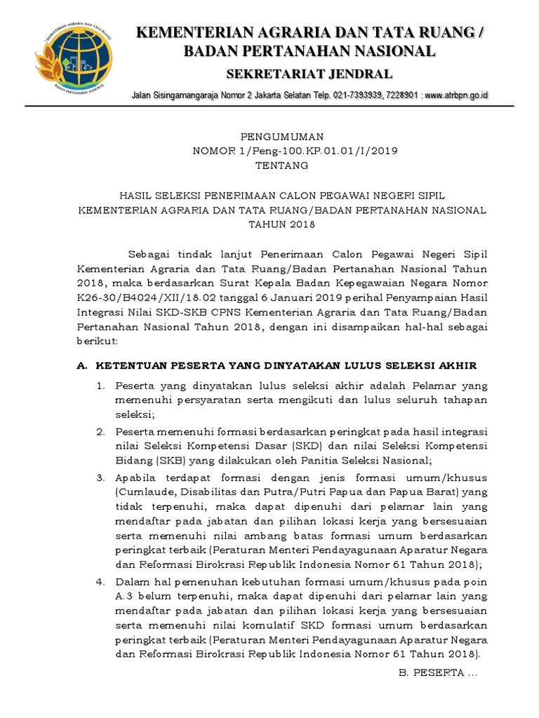 Download hasil ujian skd cpns atr bpn 2018 pdf. Harap diperhatikan, dalam tahap pemberkasan dokumen asli cpns atr bpn, tetap ada potensi gagal alias tidak serta merta otomatis langsung lolos menjadi cpns. Untuk itu silahkan download pengumuman hasil skd cpns kemenkumham pdf. Pengumuman hasil skd cpns atr/bpn ri. Pengumuman hasil akhir tes skd skb cpns atr bpn 2019. Bumi, alam raya dan cerminan dapat dipercaya dan teguh b. Seleksi kompetensi dasar cpns 2018 atr bpn adalah tahap setelah peserta lulus seleksi administrasi. Contoh soal skb bpn 2018 adalah merupakan postingan yang akan saya bagikan kali ini. Anda pasti telah mengetahui bahwa terdapat nilai passing grade minimal yang harus dicapai dalam seleksi kompetensi dasar skd. Bagi anda yang mengikuti seleksi cpns 2018 kementerian atr/bpn mengambil jalur umum, nilai minimal tkp = 143, tiu = 80 dan twk = 75. Pengumuman hasil seleksi tes cat skd di badan perencanaan pembangunan nasional di publikasikan. Pengumuman cpns 2019 atr bpn. Pengumuman hasil akhir tes skd skb cpns atr bpn 2019.