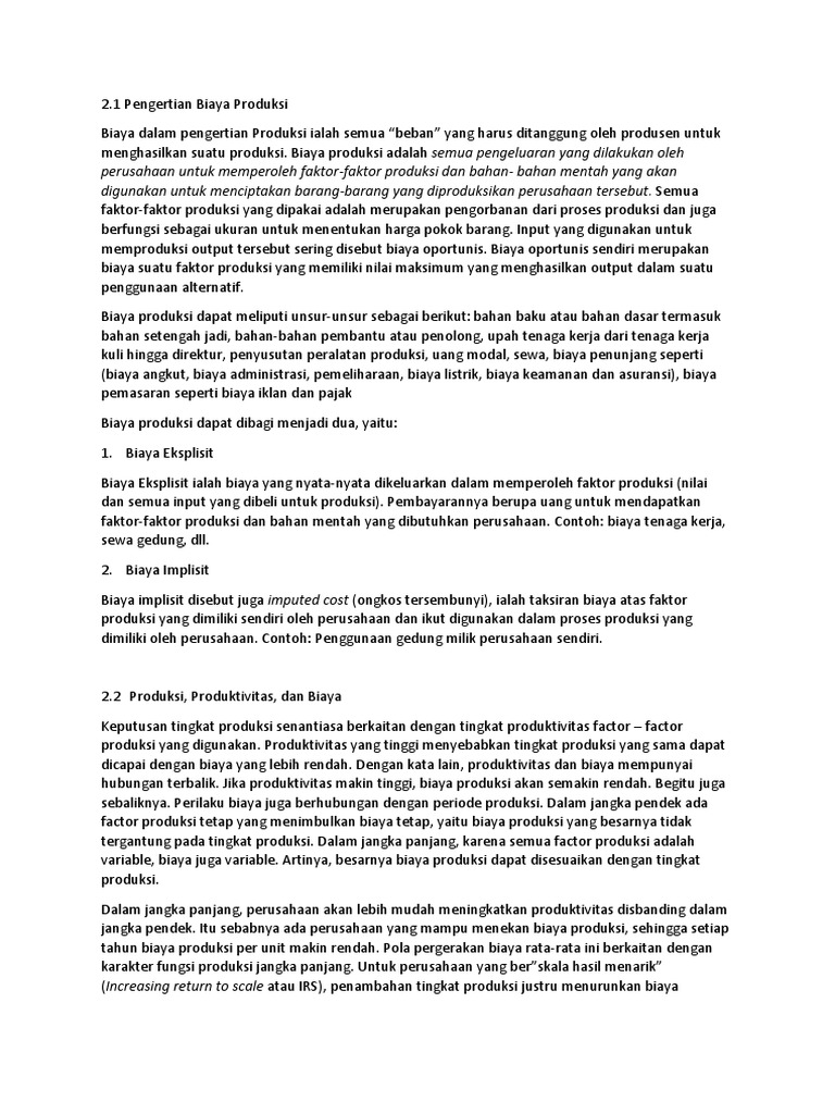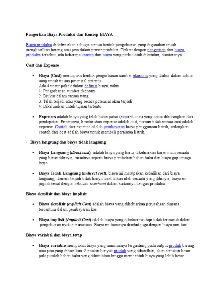 Biaya eksplisit (ec) biaya eksplisit adalah biaya yang terlihat secara fisik, misalnya berupa uang atau barang Usahatani (income) tr = penerimaan usahatani (total revenue) tc e = besarnya biaya eksplisit (total. Oleh karena itu, kita dapat menulis ulang rumus di atas menjadi: Total pendapatan minus biaya eksplisit adalah laba akuntansi. Fc = besarnya biaya tetap (fixed cost) vc = besarnya biaya variabel (variabel cost) 3. Contoh biaya eksplisit yang termasuk biaya variabel adalah: Salah satu contoh dari biaya eksplisit seperti gaji karyawan, biaya sewa gedung kantor atau usaha, utilitas (listrik, air, dll), bahan baku untuk produksi, dan biaya langsung lainnya. Biaya eksplisit ini pun memiliki besaran nominal yang sudah ditentukan dengan jelas dan berkaitan dengan laporan laba rugi. Setelah menghitung biaya eksplisit, pengacara kemudian dapat mengetahui berapa jumlah laba akuntansi. Laba ekonomi memperhitungkan biaya implisit dan eksplisit. Biaya implisit adalah jenis biaya peluang yang muncul ketika sebuah perusahaan menggunakan sumber daya internal untuk proyek tanpa kompensasi eksplisit untuk pemanfaatan sumber daya. Bagaimana cara menghitung biaya total? Rumus perhitungan laba ekonomi (economic profit), adalah sebagai berikut: